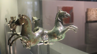 Dans l’ordre chronologique, nous commençons par les Migrations divines. C’est une exposition curieuse : les objets présentés y sont de très belle qualité, mais il s’agit en réalité de la présentation d’une collection privée suisse ( ?), ordonnée selon un thème plutôt intéressant : les cultes polythéistes antiques (grecs, romains, égyptiens) sont accueillants et n’hésitent pas à amalgamer les dieux étrangers (au cas où) pour créer des divinités à plusieurs facettes et plusieurs identités : Isis-Cérès, Jupiter-Amon ou autre. Cette bonne idée est limitée par le faible recours à d'autres fonds et par une pédagogie un peu légère (il vaut mieux être bon en mythologie et iconographie antiques !). Reste le plaisir des yeux.